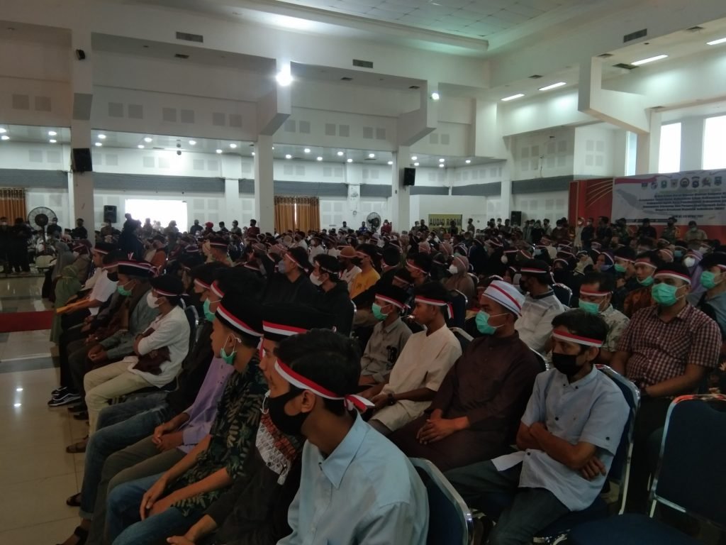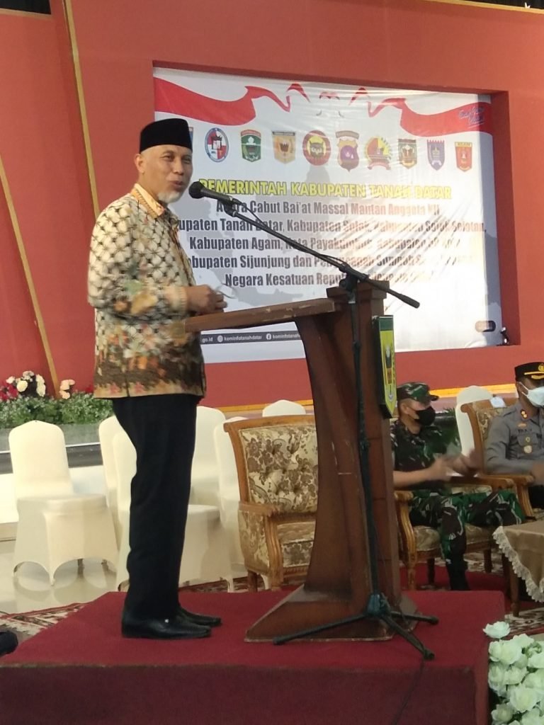 Tanah Datar – Sebanyak 518 mantan anggota jaringan Negara Islam Indonesia (NII) berasal dari Kabupaten Tanah Datar, Kabupaten Solok, Kabupaten Solok Selatan, Kabupaten 50 Kota, Kabupaten Sijunjung, Kabupaten Agam, Kota Payakumbuh dan Kota Padang mengikuti pencabutan ba’iat serta mengucapkan sumpah setia kembali kepada Negara Kesatuan Republik Indonesia (NKRI), di Gedung Nasional Maharajo Dirajo, Batusangkar, Jumat (29/4/2022).