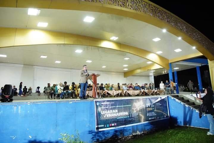 Batusangkar – Komunitas Indonesia Performance Syndicate menggelar pertunjukan karya yang berjudul Legaran Svarnadvipa, sebagai puncak kegiatan penciptaan karya kreatif inovatif dalam program Dana Indonesia, Dirjen Kebudayaan Kemendikbud Ristek RI, di Lapangan Cindua Mato, Batusangkar, Sabtu (29/6/2024).