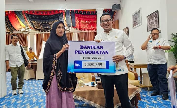 Batusangkar, Bupati Tanah Datar Eka Putra menyerahkan secara simbolis bantuan kepada 59 orang masyarakat penerima manfaat program Berobat Gratis, Jum’at (12/7/2024) di Indo Jolito Batusangkar.