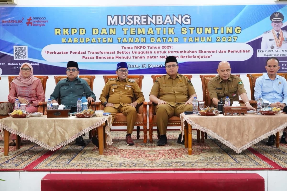 Musrenbang yang dibuka Bupati Eka Putra turut dihadiri Wabup Ahmad Fadly, Senin (31/3/2026) di aula kantor Bupati bertujuan penyampaian program prioritas beserta tema pembangunan Kabupaten Tanah Datar tahun 2027 dan menjaring masukan dan kesepakatan terhadap rancangan Rencana Kerja Pemerintah Daerah.