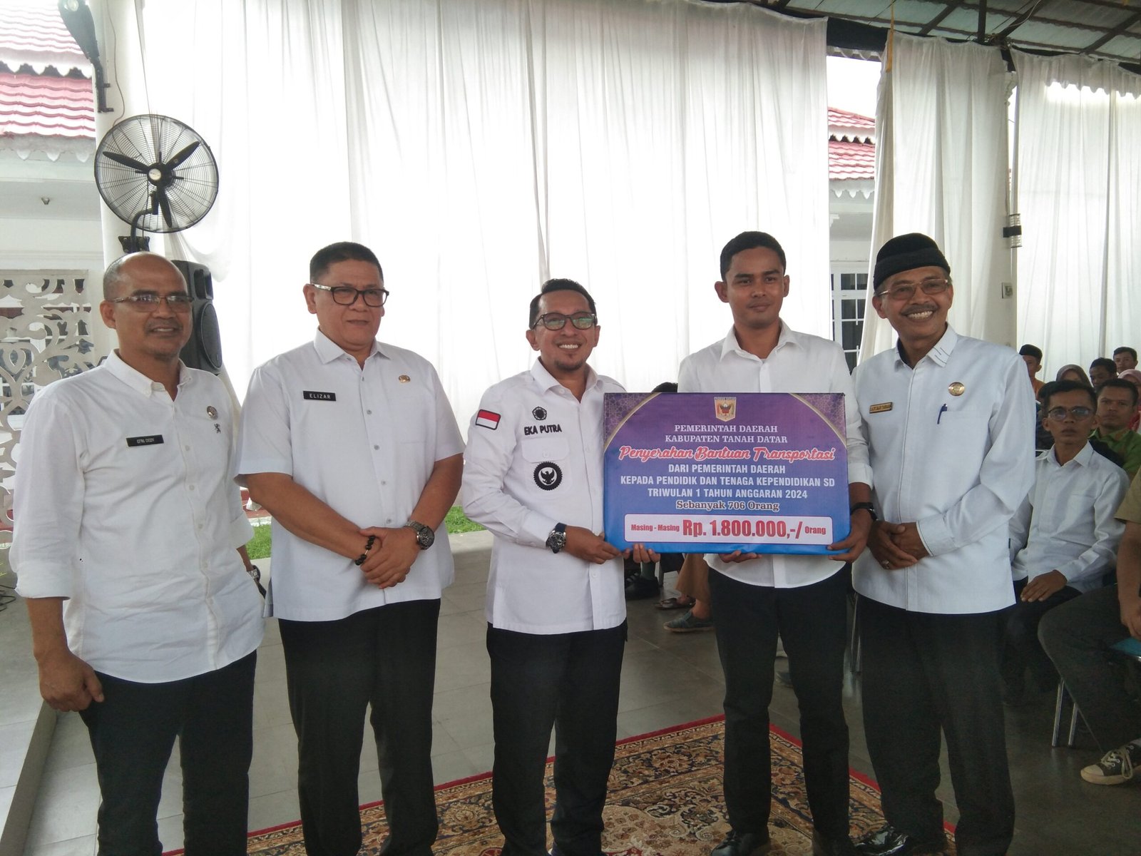 ” Adapun dana yang kita cairkan pada hari ini adalah bantuan transportasi tri wulan pertama, yang berjumlah 1.800.000 rupiah per orang. Ini adalah salah satu bentuk perhatian Pemerintah Daerah terhadap dunia pendidikan khususnya kesejahteraan guru-guru, atau tenaga pendidik dan tenaga kependidikan atau, yang berstatus sebagai pegawai honorer atau tidak tetap,” tutur Eka Putra.