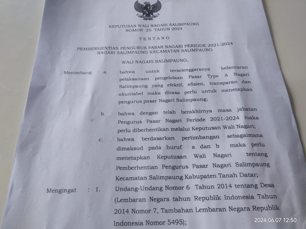 Juga awak media ini tanyakan aturan atau tentang SK pemberhentian, karna di SK tersebut, mengacu ke Undang-undang permendes, tentang pengankatan dan pemberhentian perangkat Desa atau perangkat Nagari, sedangkan pengurus Pasar bukan termasuk perangkat, namun inilah jawaban wali nagari tersebut.