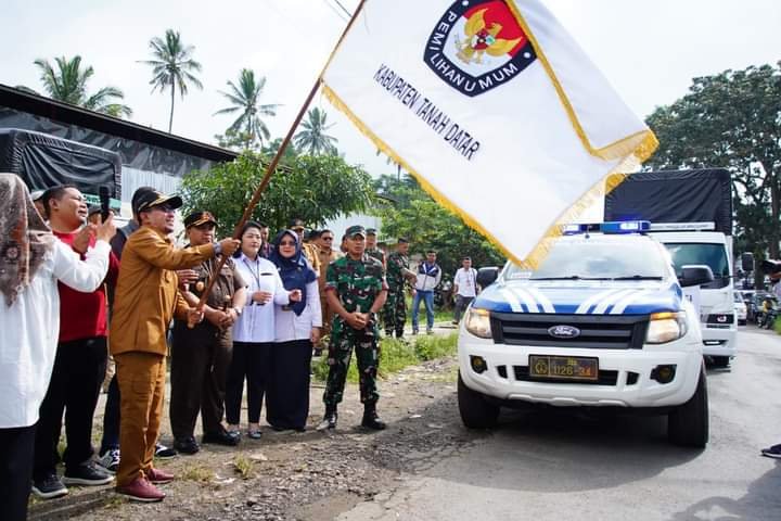 Batusangkar, Resmi dilepas Bupati Kabupaten Tanah Datar Eka Putra, SE, MM, logistik Pemilihan Umum (Pemilu) tahun 2024 meluncur ke berbagai pelosok nagari yang ada di Kabupaten Tanah Datar.