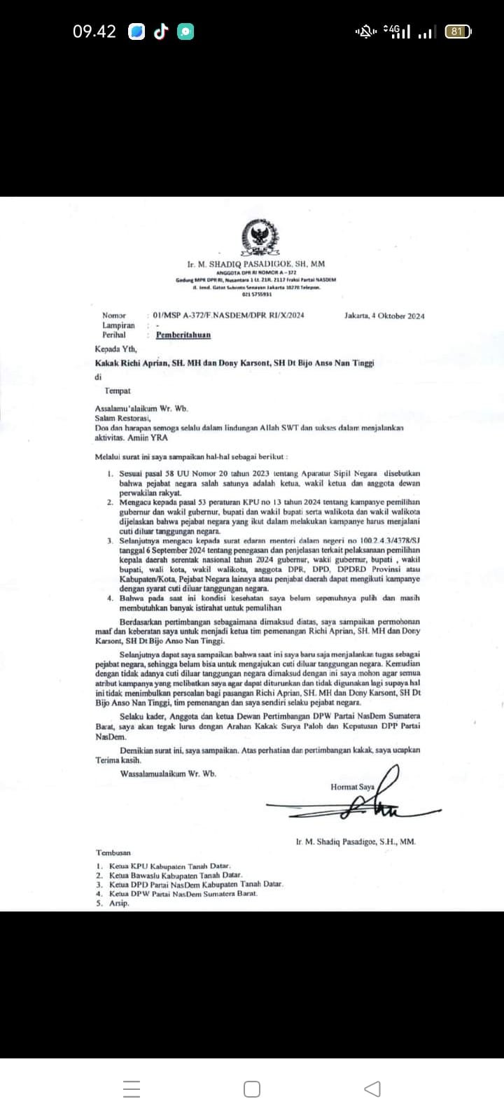 TANAH DATAR – Dengan beredarnya surat pengunduran diri M.Sadiq Pasadigue, anggota DPR-RI, dari Partai Nasdem, sebagai Ketua Pemenangan Pasangan Calon Bupati Tanah Datar yang bernomor Urut 1, (Rido), menimbulkan rumor yang beredar di tengah-tengah masyarakat.