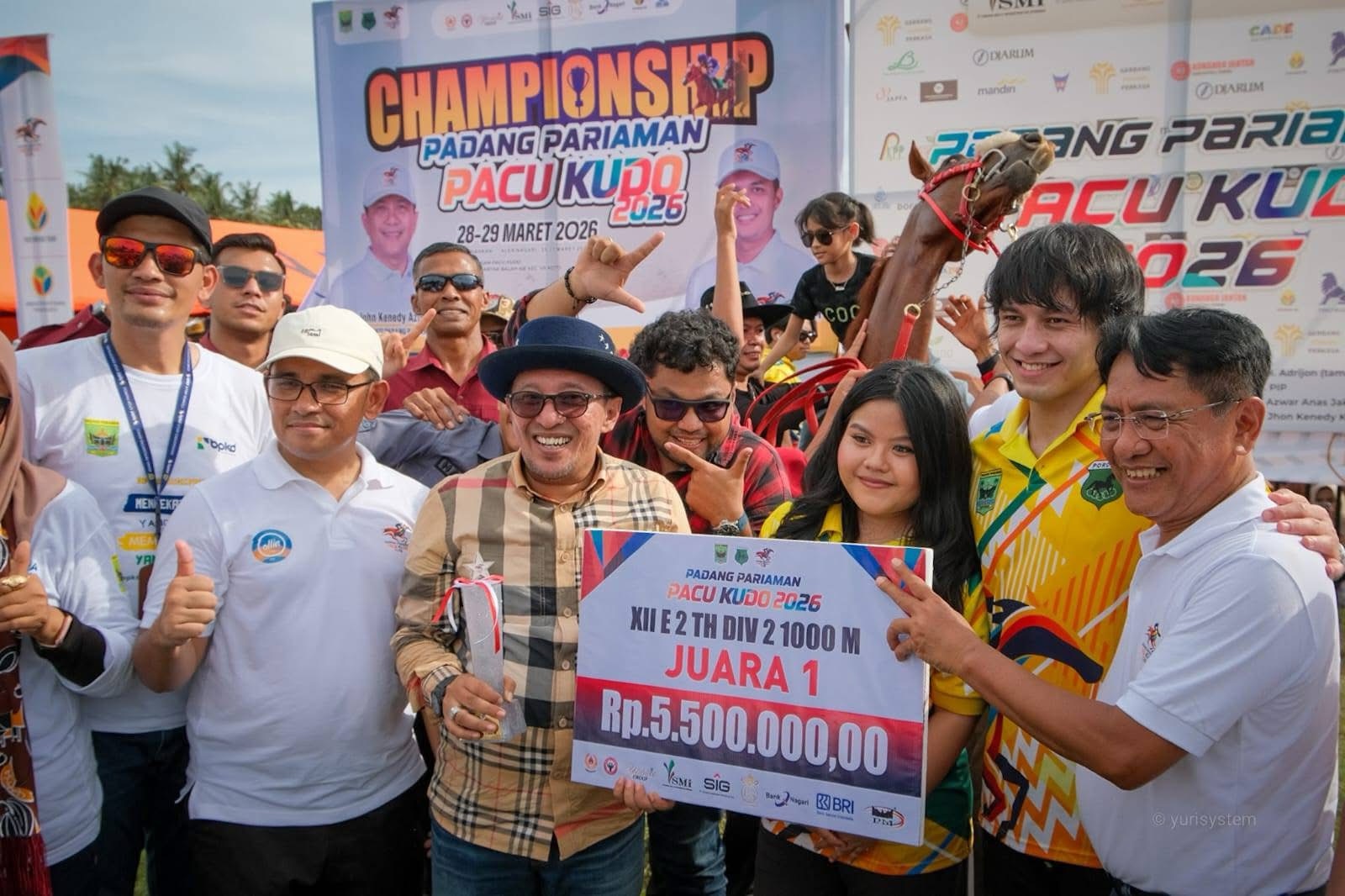 Kuda Queen Mentari milik Bupati Tanah Datar Eka Putra, SE, MM ikut turun berpacu dan tampil juara I race 12, pada alek Pacu Kuda 2026 Padang Pariaman di Lapangan Pacu Kuda Duku Banyak, Nagari Balah Aie, Kecamatan VII Koto Kabupaten Padang Pariaman, Sabtu (28/03/2026).