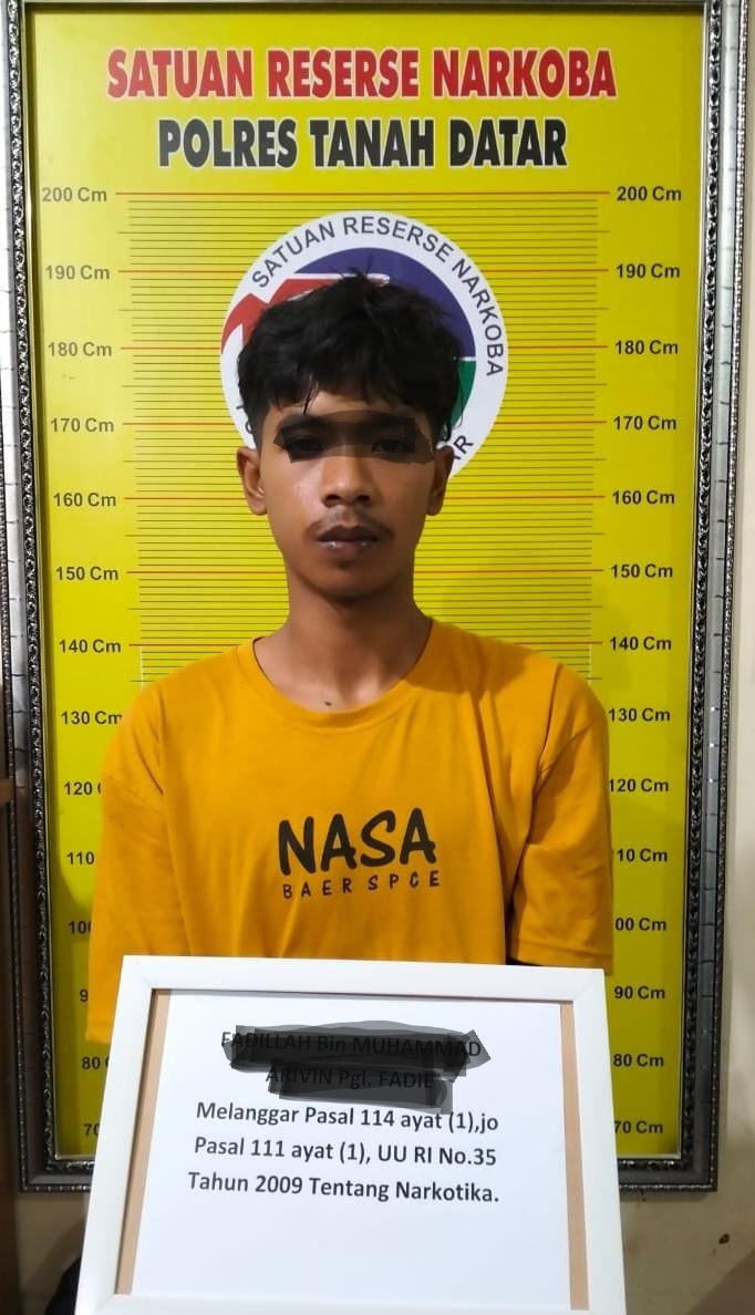 Tim Opsnal (Tarantula) Sat Res Narkoba Polres Tanah Datar berhasil mengamankan 1 (satu) orang laki-laki berinisial FL (20) , Warga komplek Luak Sarunai Jorong Malana Ponco Nagari Baringin Kecamatan Lima Kaum. Demkian dijelaskan Kapolres Tanah Datar, AKBP Ruly Indra Wijayanto, SIK. M.Si, melalui Kasubag Humas AKP Desfi Arta kepada kepada media ini, Selasa (06/09).