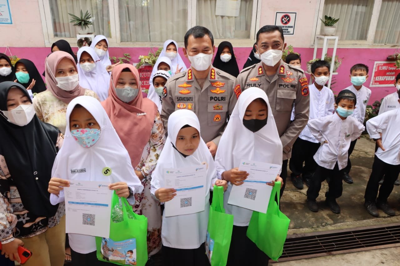 Selain memberikan bingkisan, Kombes Pol Satake Bayu juga memberikan semangat serta dukungan kepada para murid di SDN 07 dan 10 Lima Kaum untuk mengikuti Vaksinasi ini.